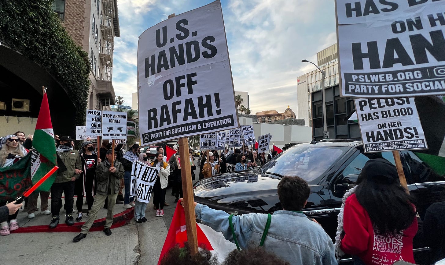 BEVERLY HILLS, Calif. — An angry crowd of anti-Israel protesters surrounded the driveways leading into the famously fancy Beverly Wilshire because former Speaker of the House Nancy Pelosi was having an event inside.