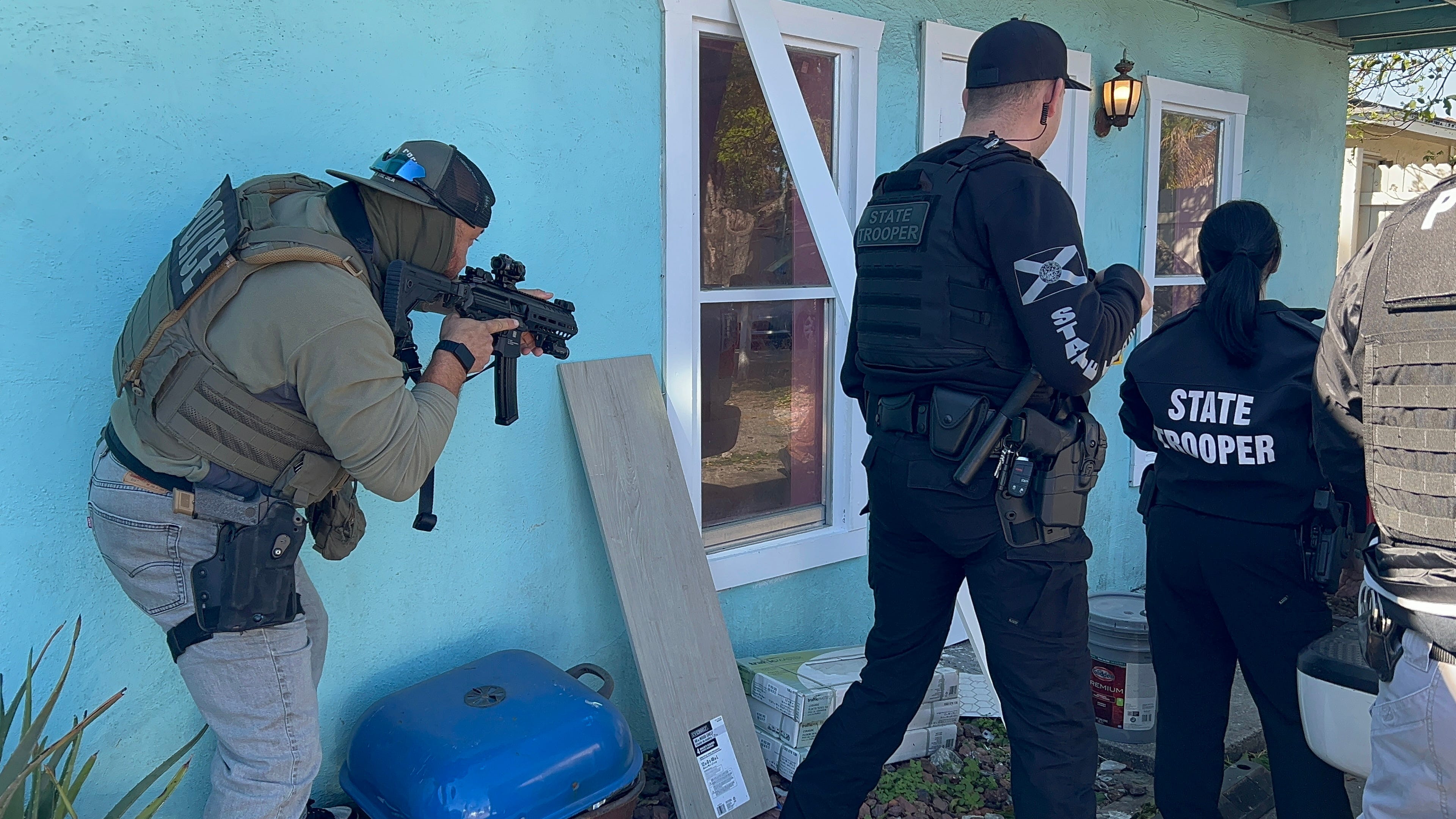 In what was supposed to take 30 minutes from where we started, we made it to the scene in less than 20 minutes thanks to the flashing lights and sirens. By the time we arrived, other members of the task force, which included U.S. Immigration and Customs Enforcement, Border Patrol, and Diplomatic Security Service, were ordering the suspects to come out of the house. Fort Lauderdale police were also on standby.