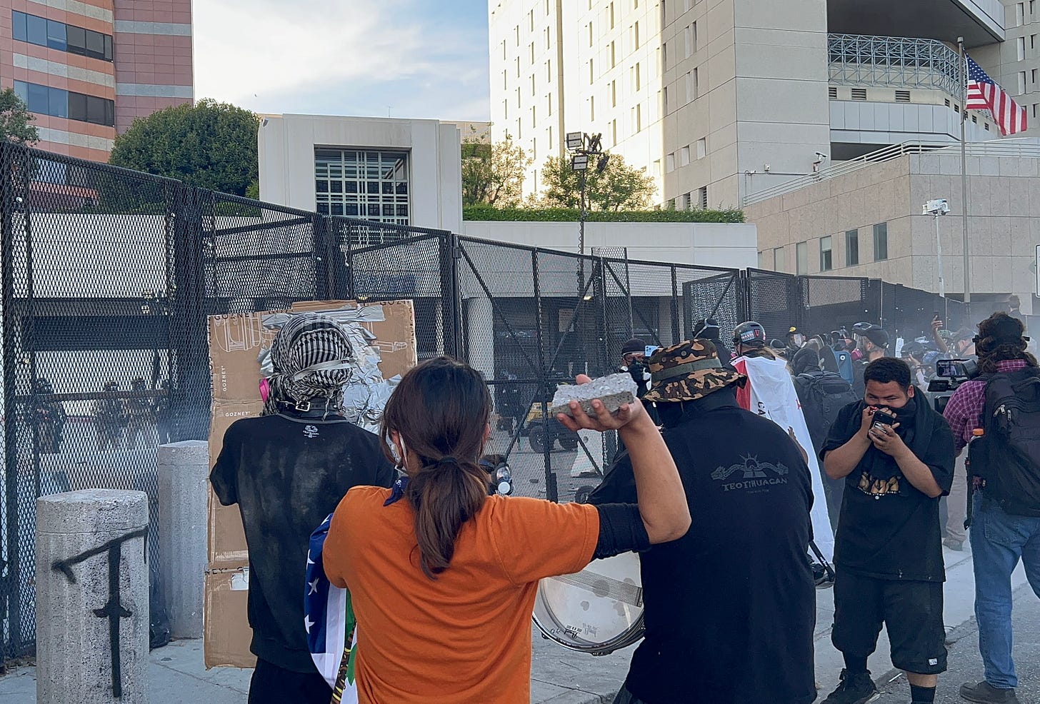 Once most of the tear gas dissipated, the crowd came back to continue their attacks. It took some more time before the Los Angeles Police Department showed up. Dozens of protesters and rioters remained in the street despite several dispersal warnings from police. Federal agents and LAPD did make arrests, targeting those who threw concrete or did not leave the area. The Los Angeles Times reported 70 people were arrested.