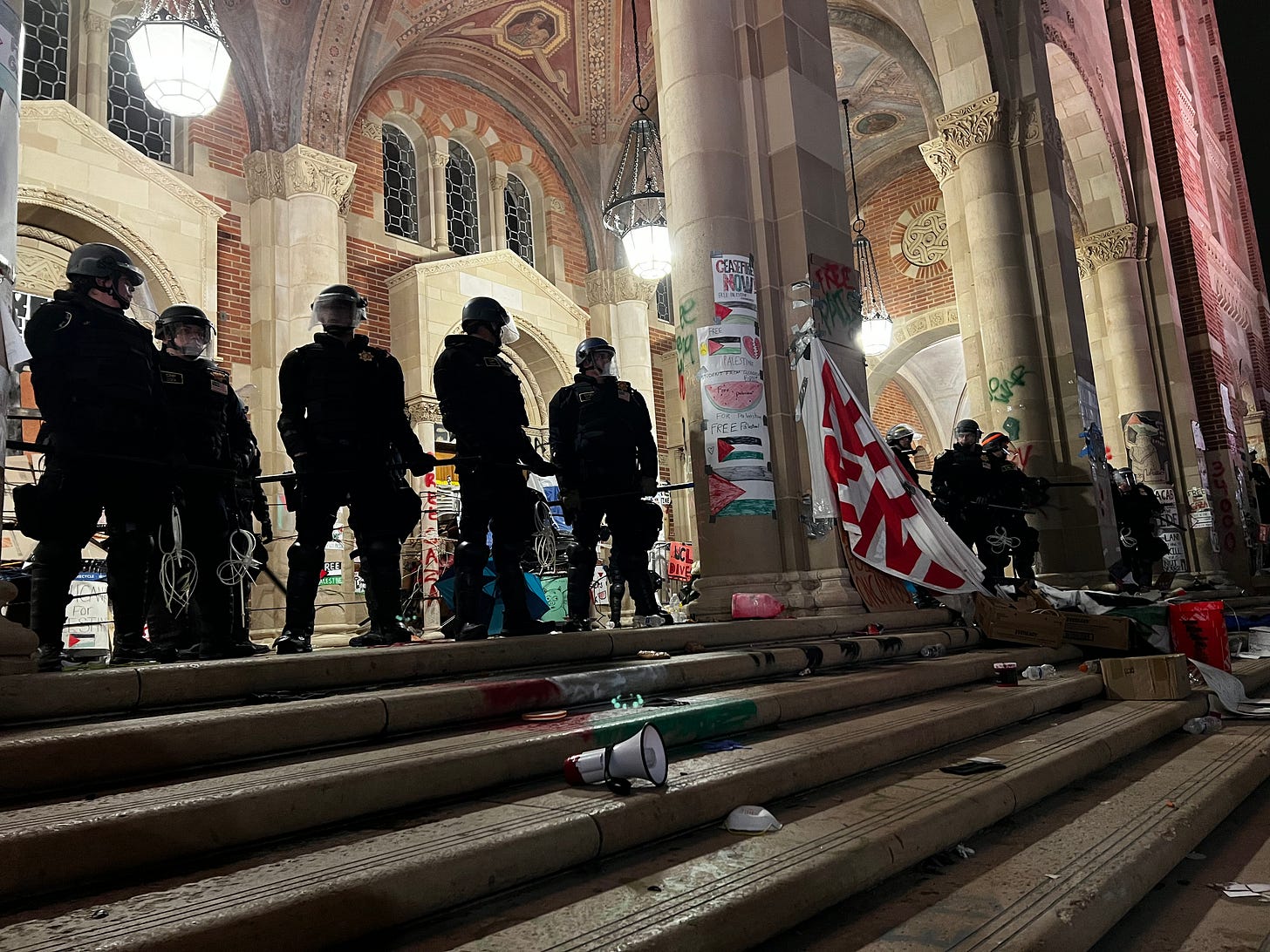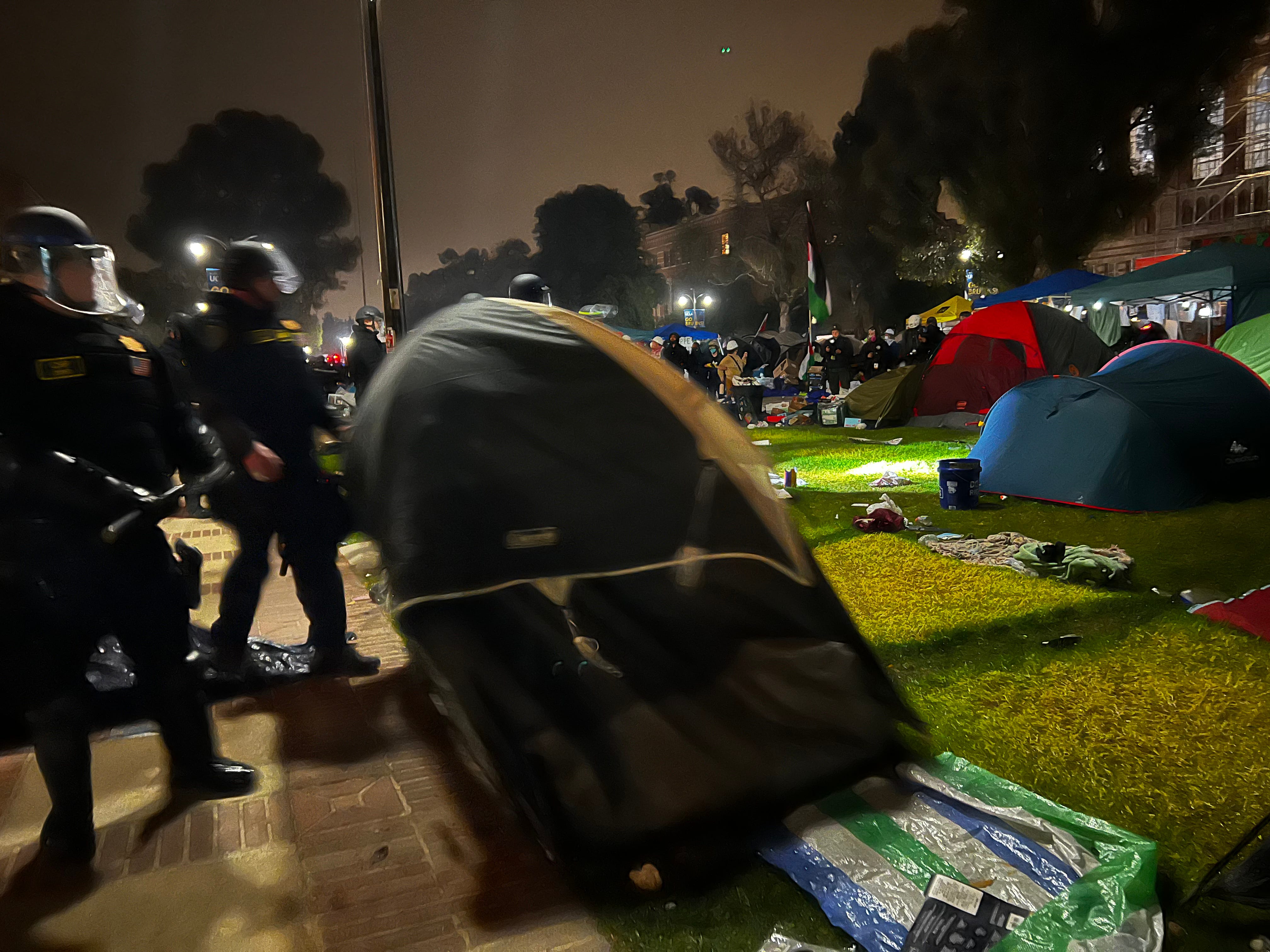 But it was only delaying the inevitable. The left side was eventually breached and police rapidly cleared away people from the entrance of Royce Hall. Tents were ripped up and barricades were tossed aside. The giant Palestinian flag in the middle of the camp was thrown to ground by a CHP officer. People who refused to leave were arrested.