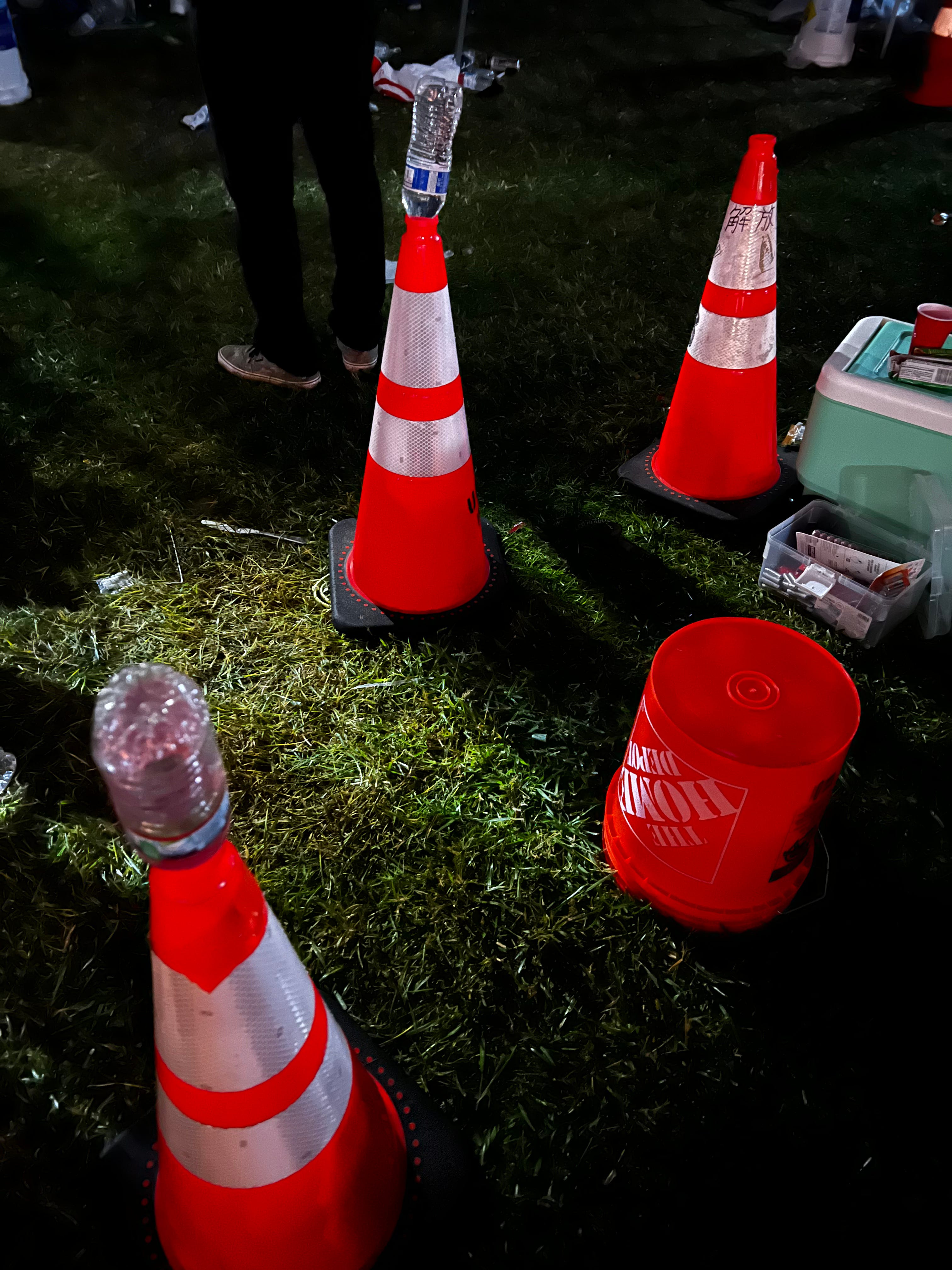 Behind the wall, protesters were prepared for the use of tear gas. They placed water bottles upside down on top of traffic cones, so they can place them over a canister and water it down to stop the gas.